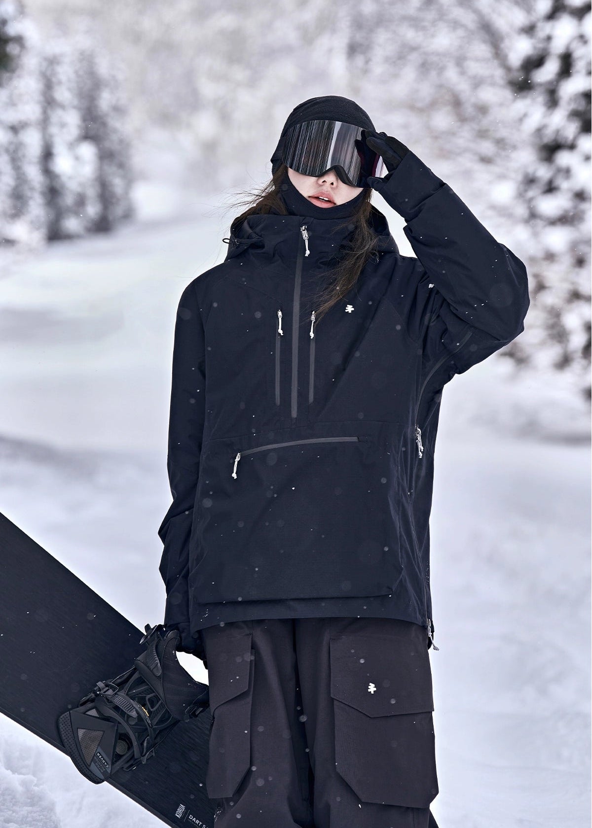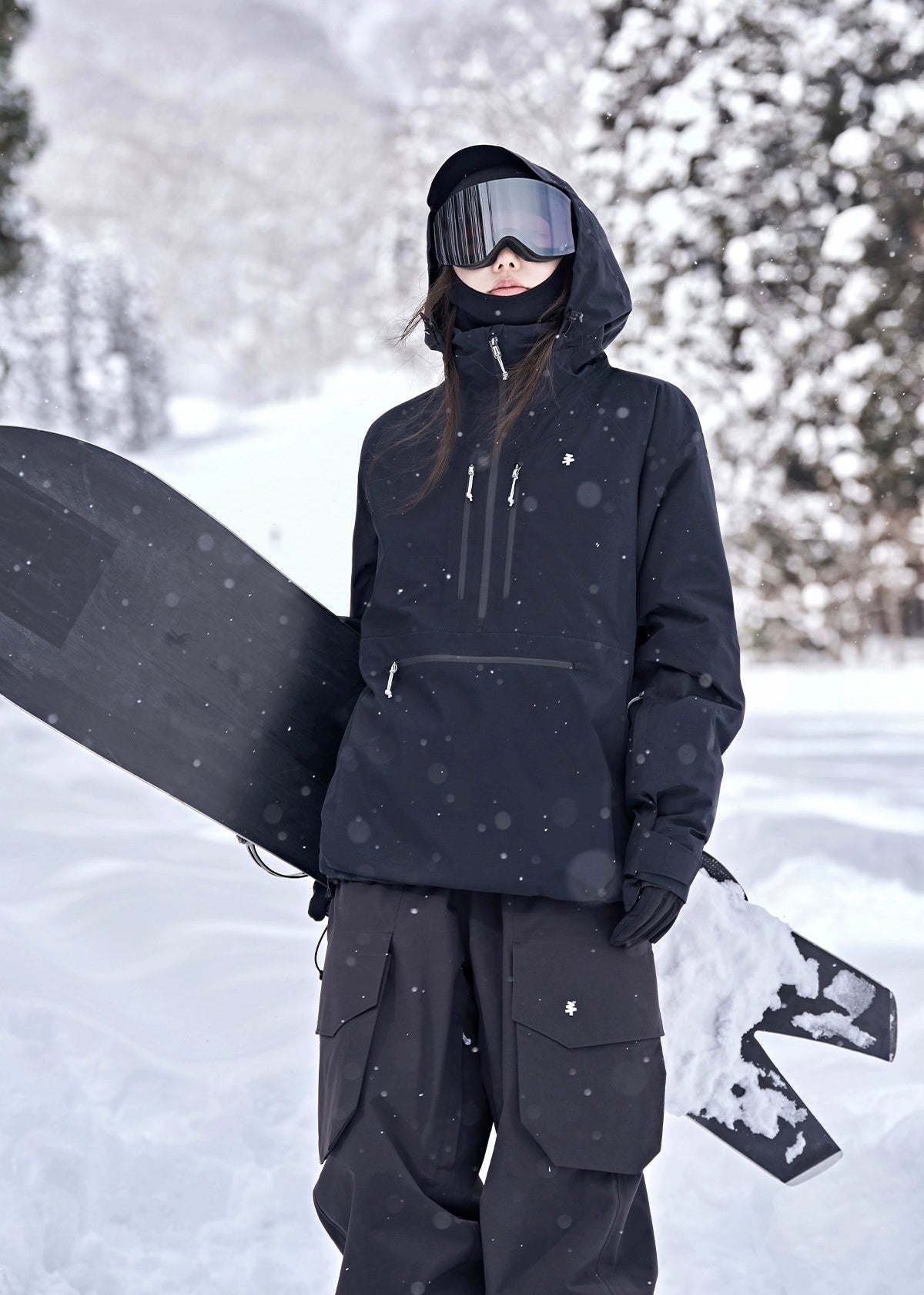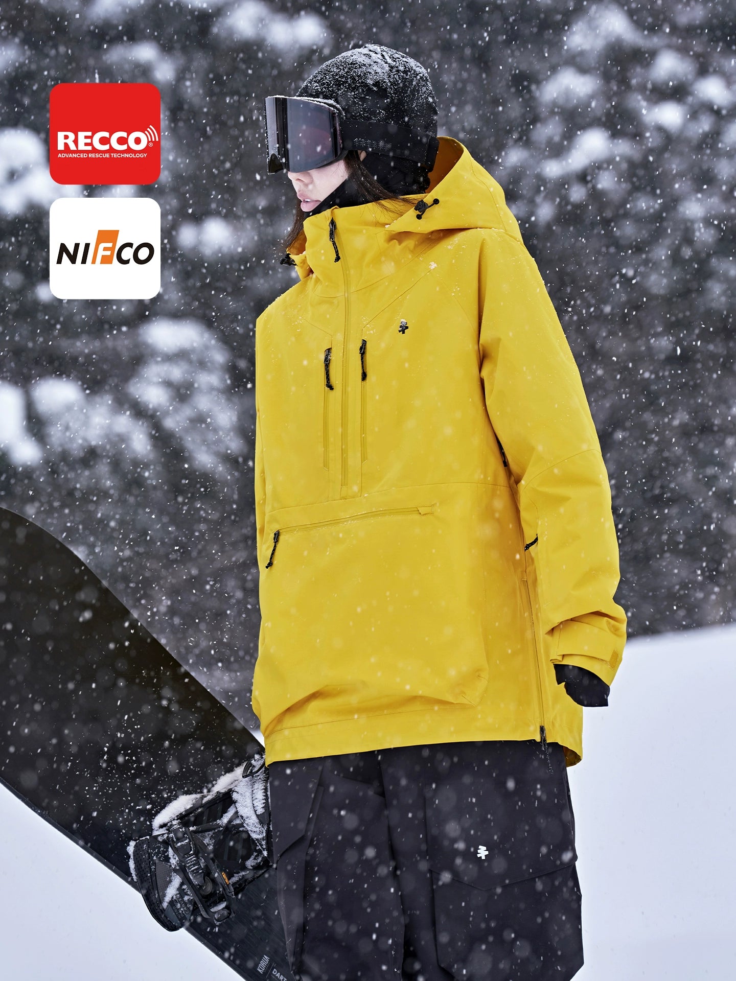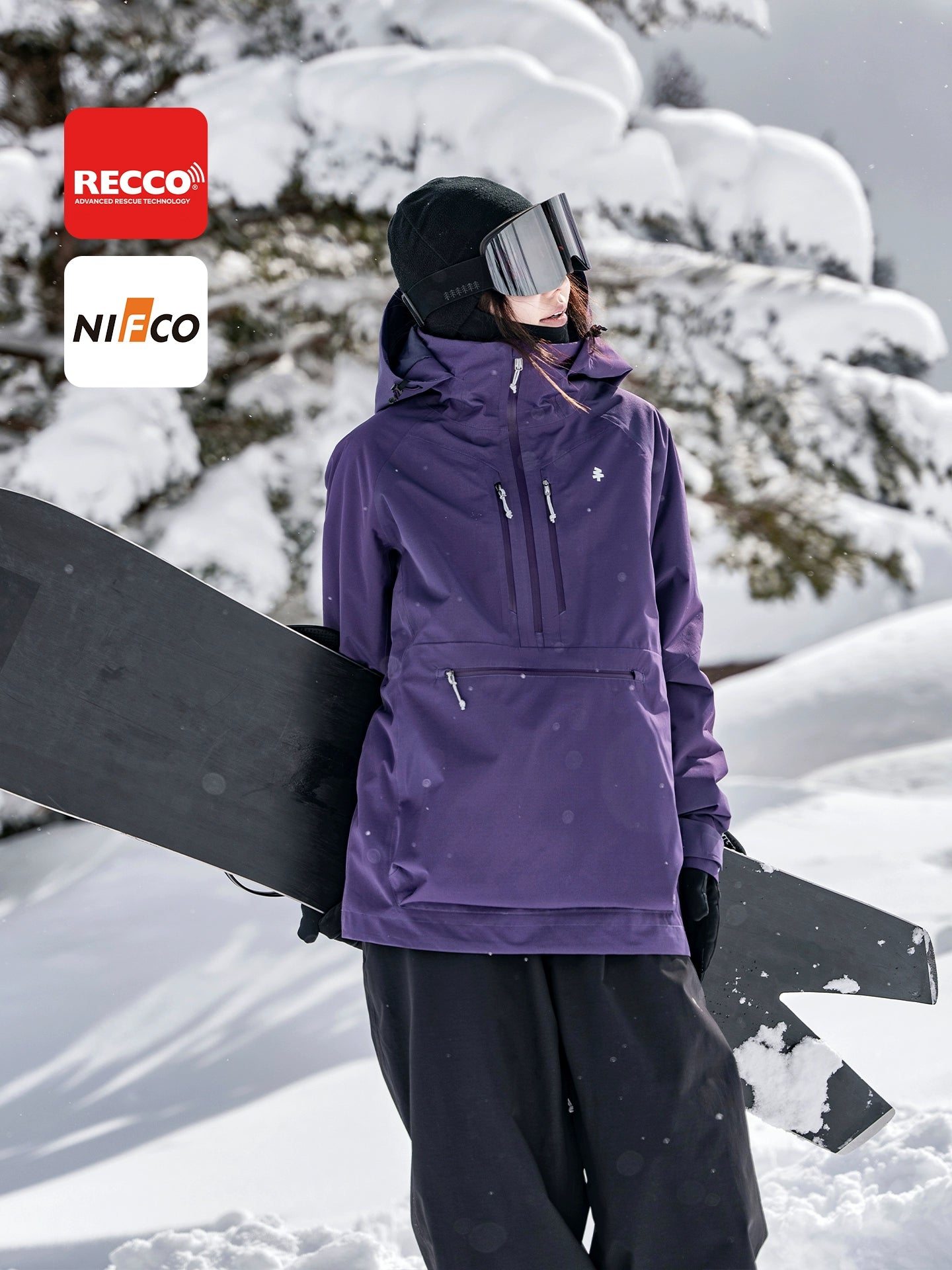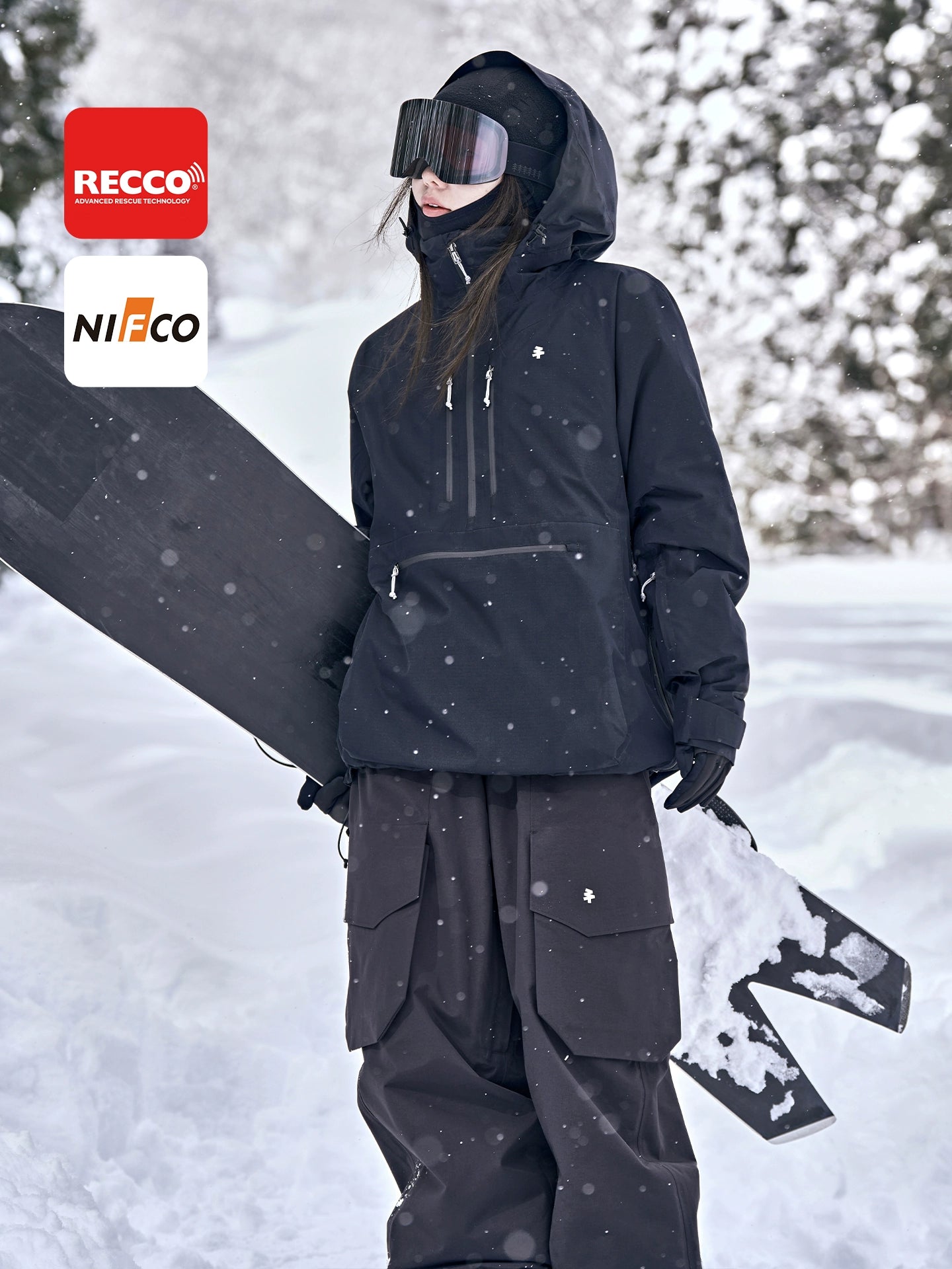 The pullover features a sleek matte black 2-layer composite fabric with a high collar and adjustable hood, complemented by W&T waterproof zippers and NIFCO buckles. Visible design elements include a semi-zip front, chest storage pocket, hem drawstring and adjustable waist for a customizable fit. Underarm ventilation zippers, elastic snow cuffs and integrated RECCO avalanche rescue reflectors add both functionality and safety.