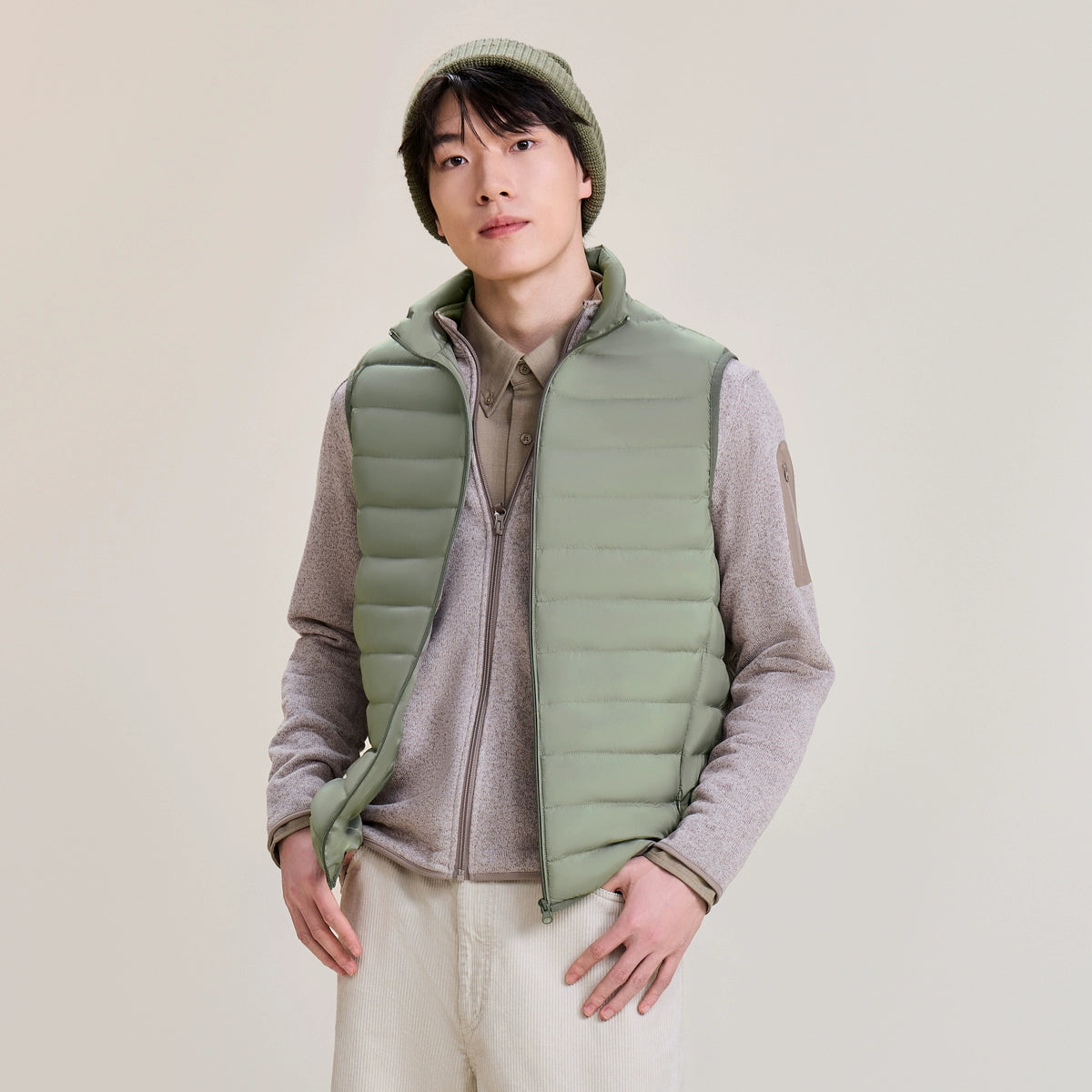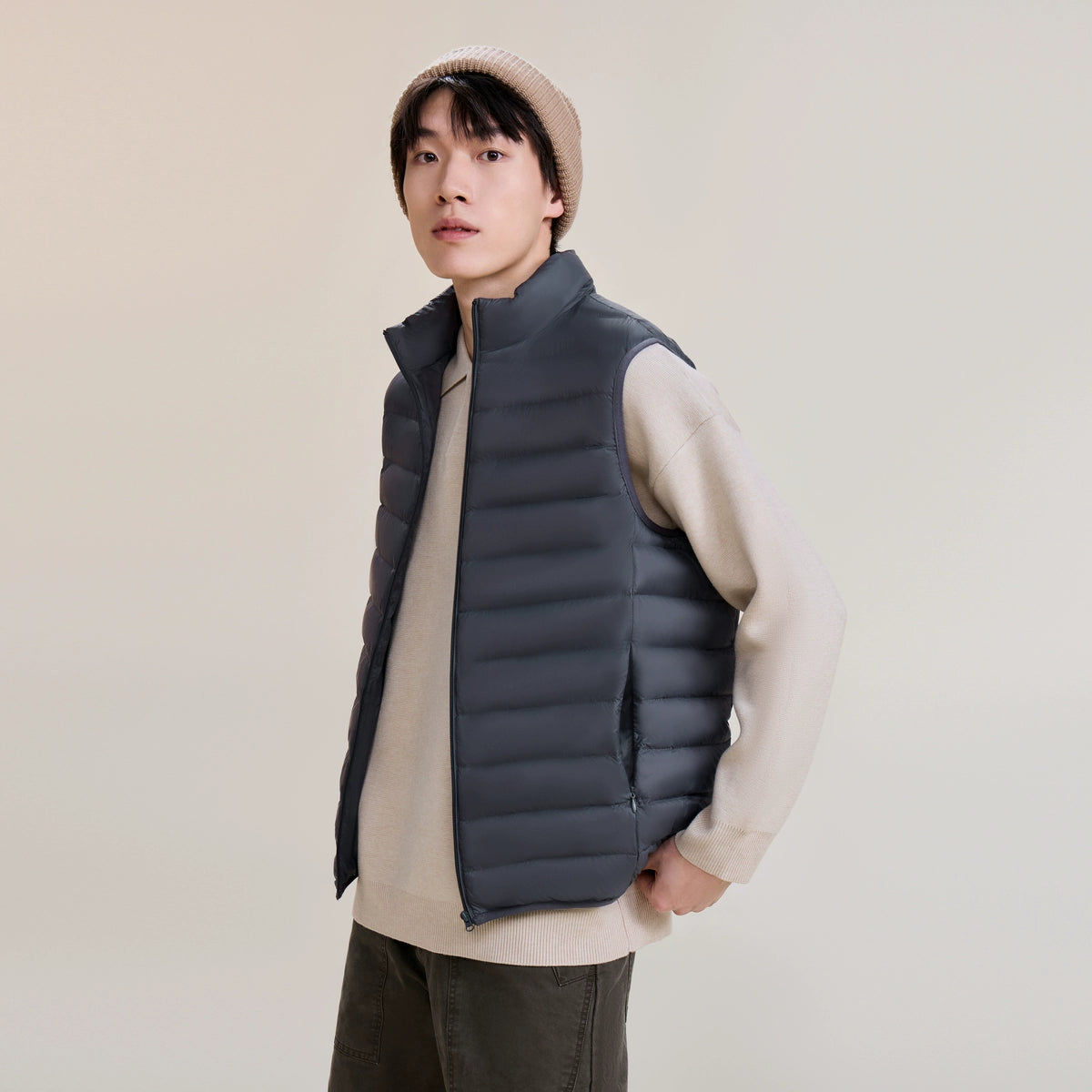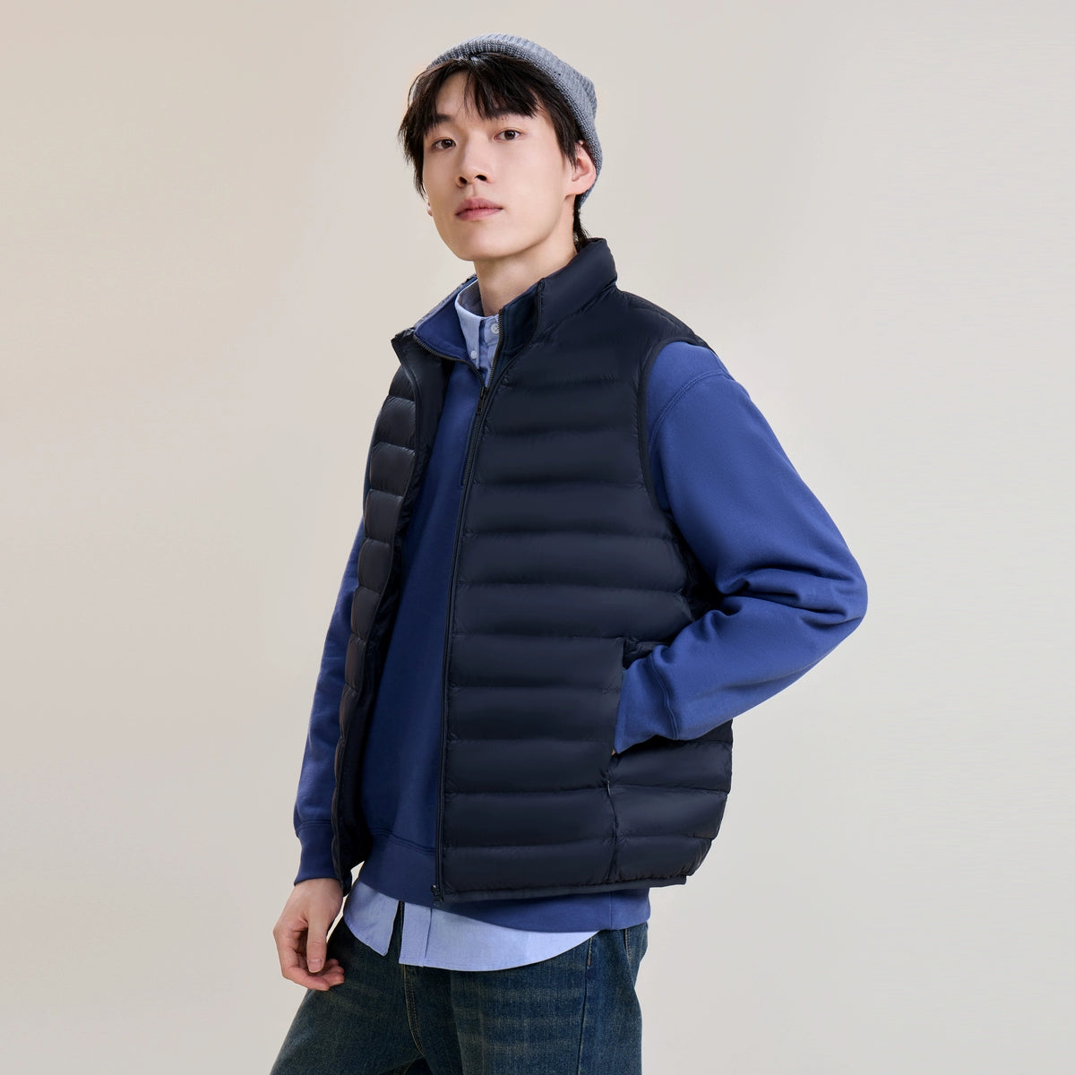 The ThermaGuard Down Vest features a unisex design available in an array of sophisticated colors: Midnight Blue, Charcoal Blue, Soft Sage Green, Midnight Shadow, and Pale Grey. Its lightweight and compact build ensures effortlessly versatile layering.