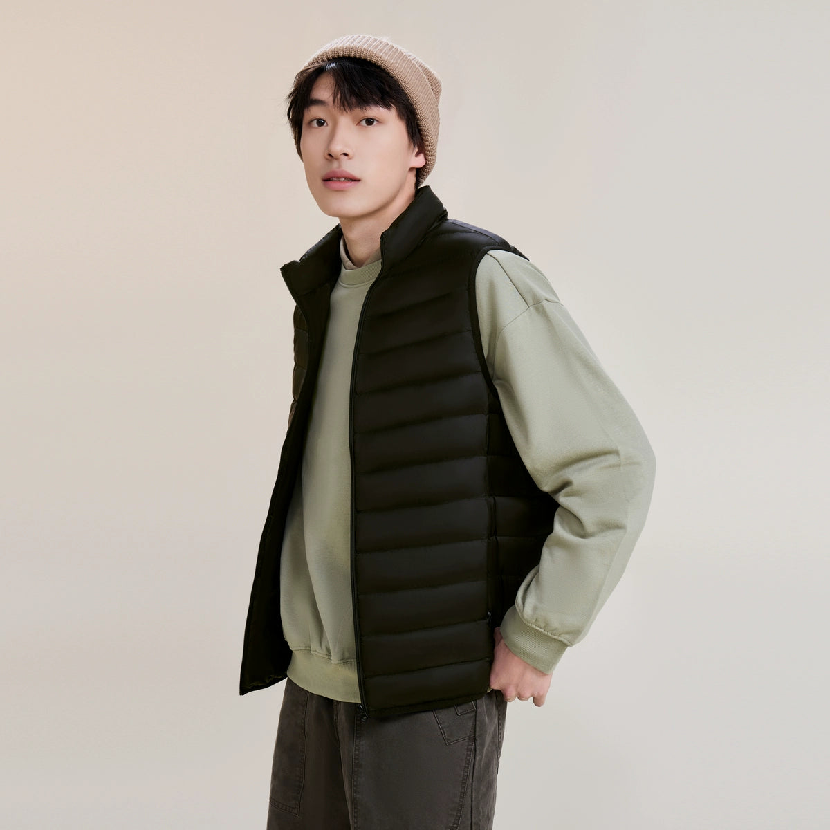 Hidden pockets and a smooth zipper design add functional convenience, while the three-layer construction integrates a smooth outer, a down-proof middle, and a comfortable inner lining, ensuring both warmth and comfort.