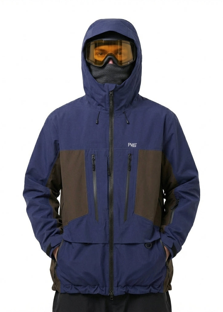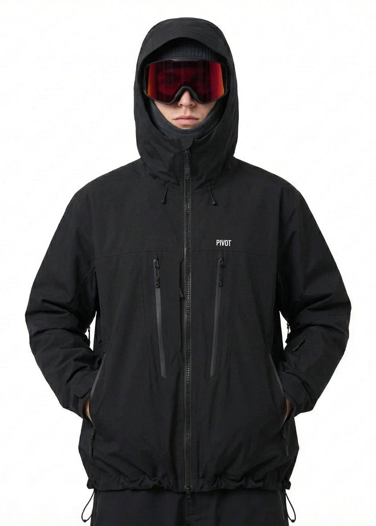 The sleek black exterior showcases a minimalist design, complete with a secure hood, dual SBS plastic zippers, and vertical waterproof chest pockets accented by the subtle POMT logo, ensuring a modern alpine aesthetic.